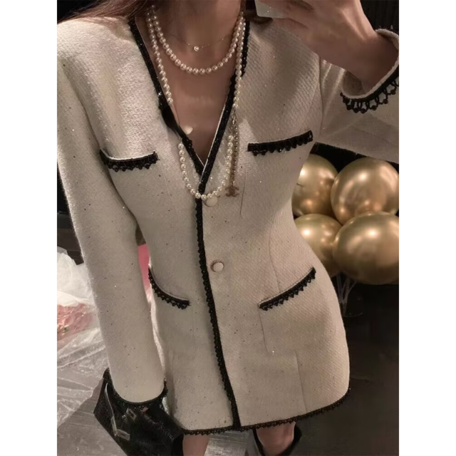 シックで高級感漂うフレンチVネック 白いツイードワンピースジャケット。上品なデザインとツイード素材が、大人の女性に華やかさをプラスします。フロントのボタンの開け閉めで、ワンピースにするか、ジャケットにするかを楽しめるスタイルで、オフィスやお出かけにもピッタリ。ウエストをシェイプするデザインなので、スタイルアップも叶います。 厚手のしっかりとした生地感で、BLACKのビシューを細部に施し、こだわり抜いた逸品です。 洋服への愛と情熱が詰まった一着となっています。 このワンピースジャケットは、2通りの着用ができるアイテムなのが特徴的です。あなたが羽織ることで、自信と女性らしさを引き出してくれる特別な一着です。女性の心をくすぐるエレガントなデザインは、周りの人たちからの称賛の眼差しを集めること間違いありません。 自信を持って、このワンピースジャケットをお使いください。大切な場面での存在感を演出し、自分らしさを表現するお手伝いをします。