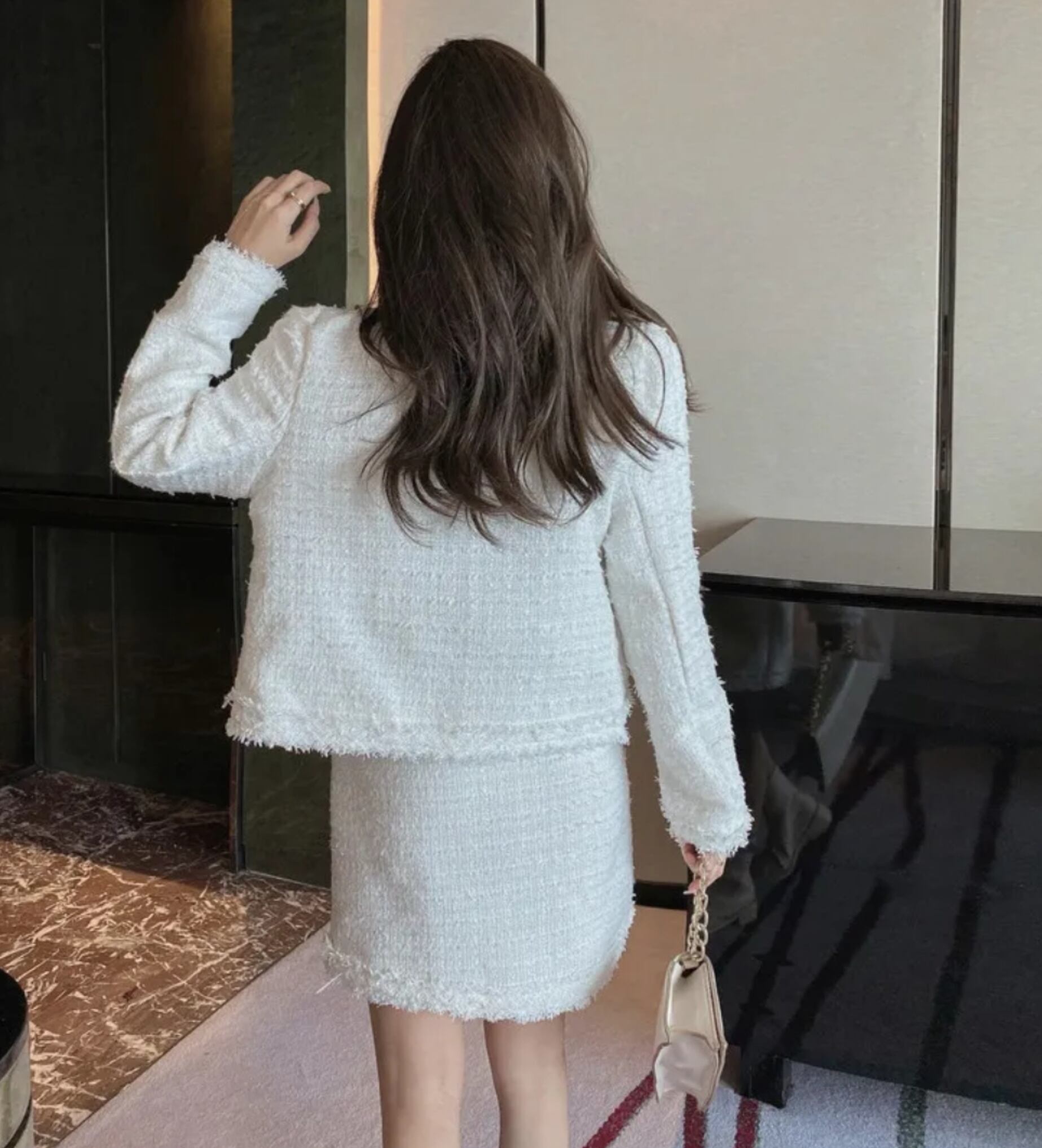 ヴィンテージ風のツイード2ピースセットで、あなたの魅力を更に引き立てましょう。このセットを手に入れれば、お洒落なシーンがもっと楽しくなること間違いなしです。