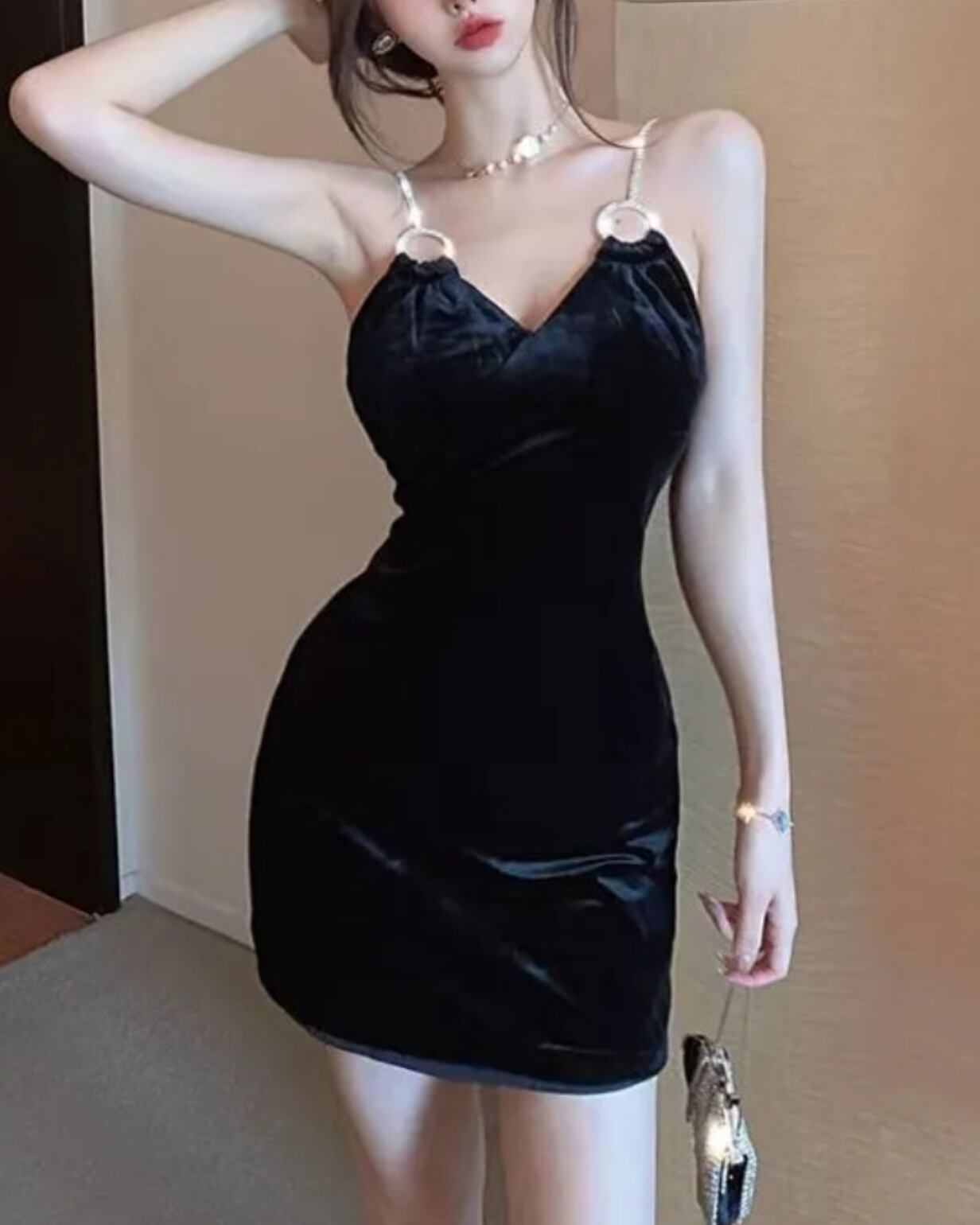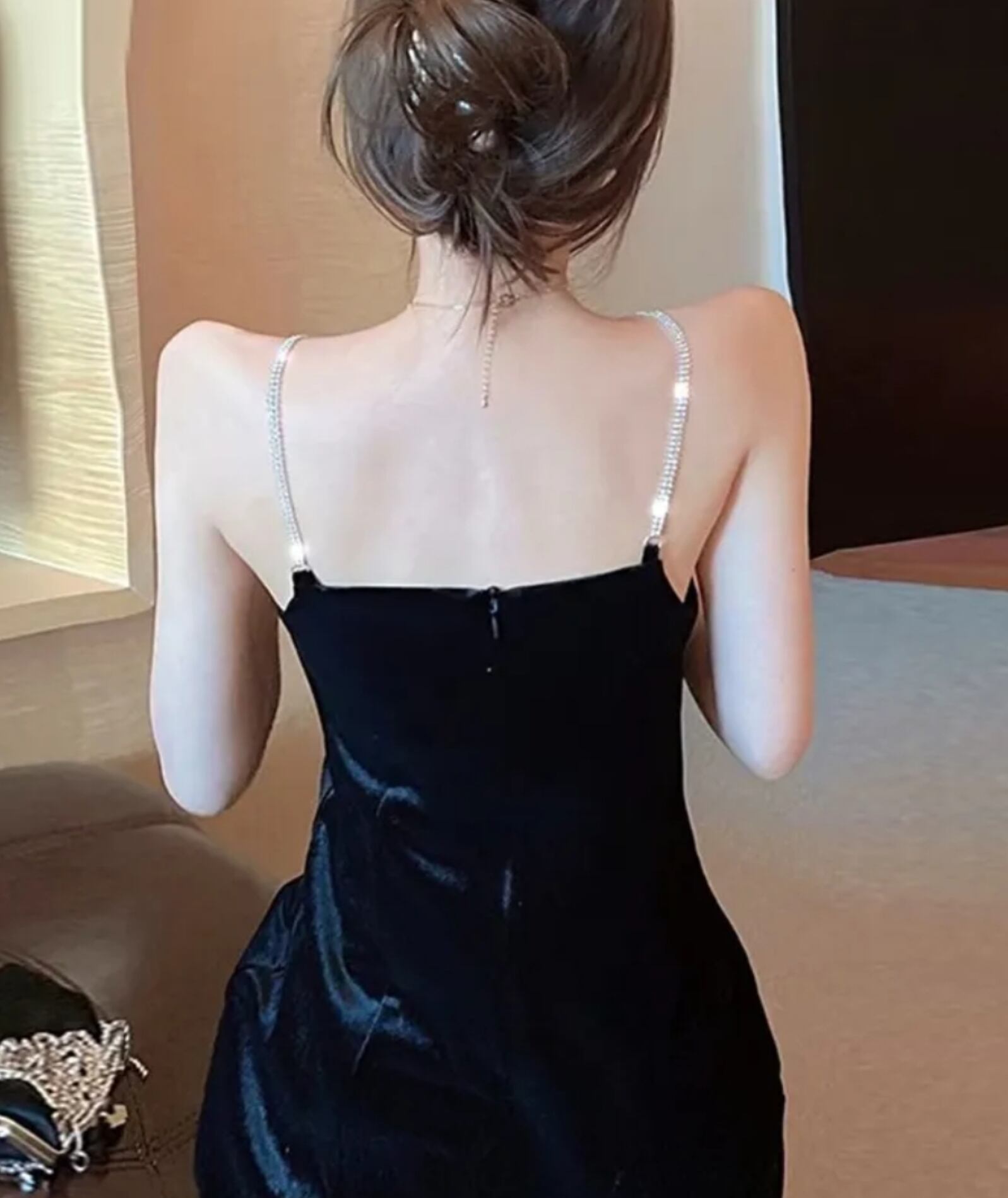 このセクシーなベルベットドレスは、シンプルなドレスの中でも生地や肩紐ラインのデザインに個性をプラスし、ワンランク上の美しさを。