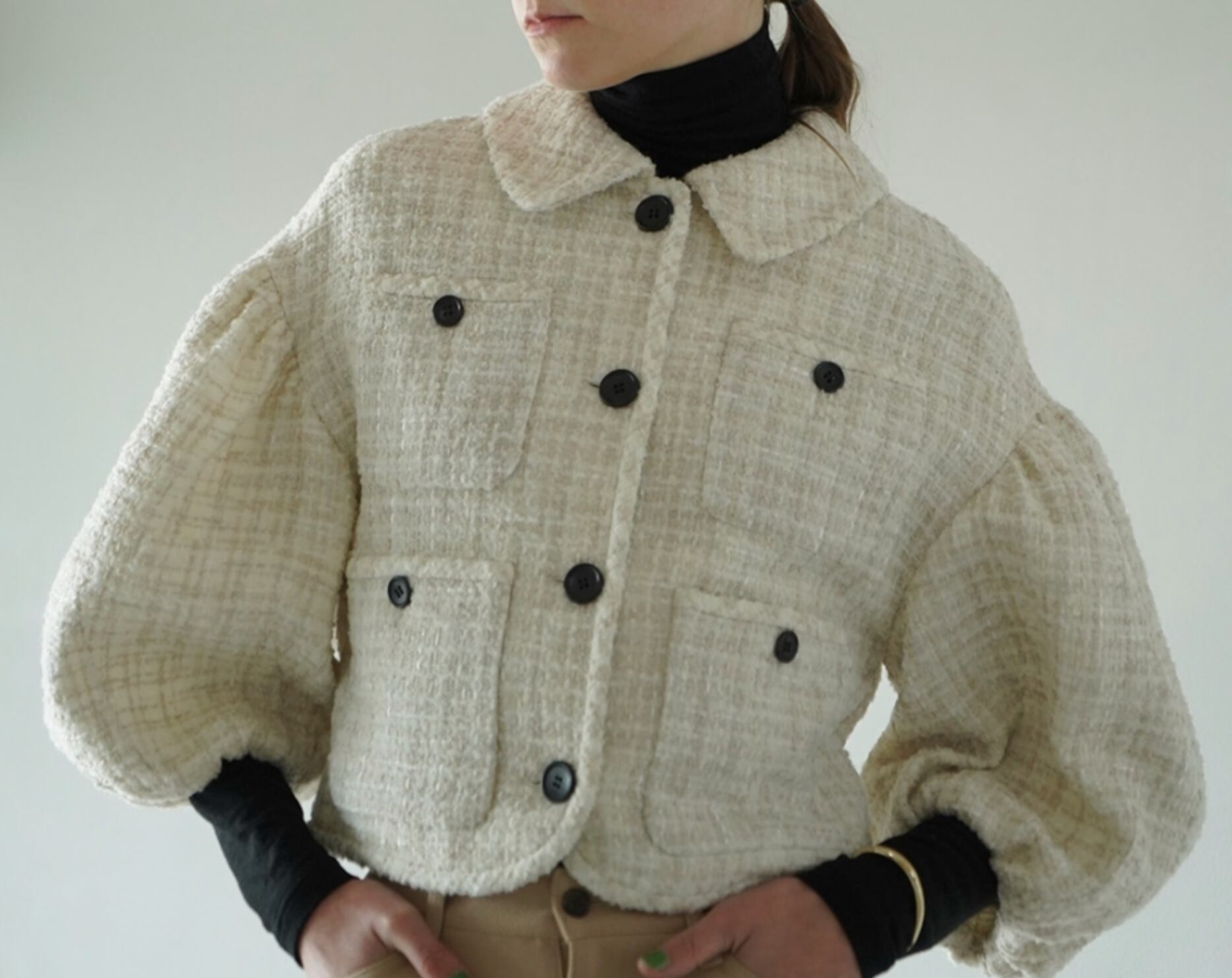 優雅なヴィンテージチェックツイードが魅力のジャケットです。2色展開でご用意しましたので、お好みに合わせてお選びいただけます。大人のパフスリーブやクロップドデザインなど、トレンド感溢れるデザインでありながらも、上品さや華やかさも忘れません。ヴィンテージ感漂う素材は、カジュアルスタイルにもフェミニンなスタイルにもマッチし、幅広いシーンでご活用いただけます。大人の女性にふさわしい、エレガントな印象を与える一着です。