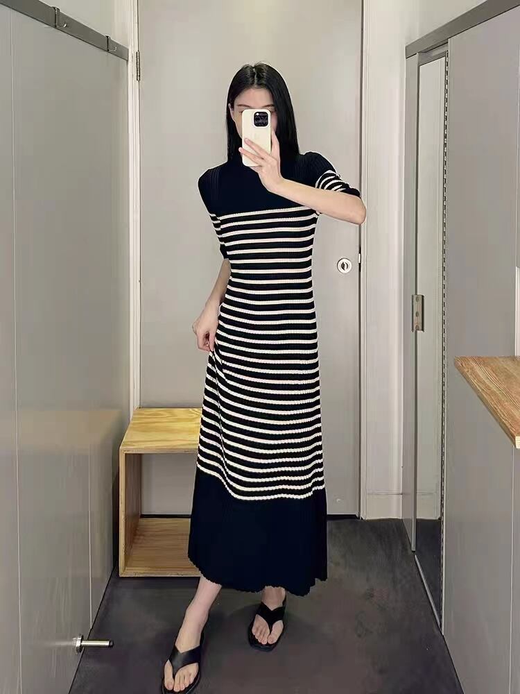 ストライプロングニットワンピースは、シンプルでありながら存在感のあるデザインが魅力です。