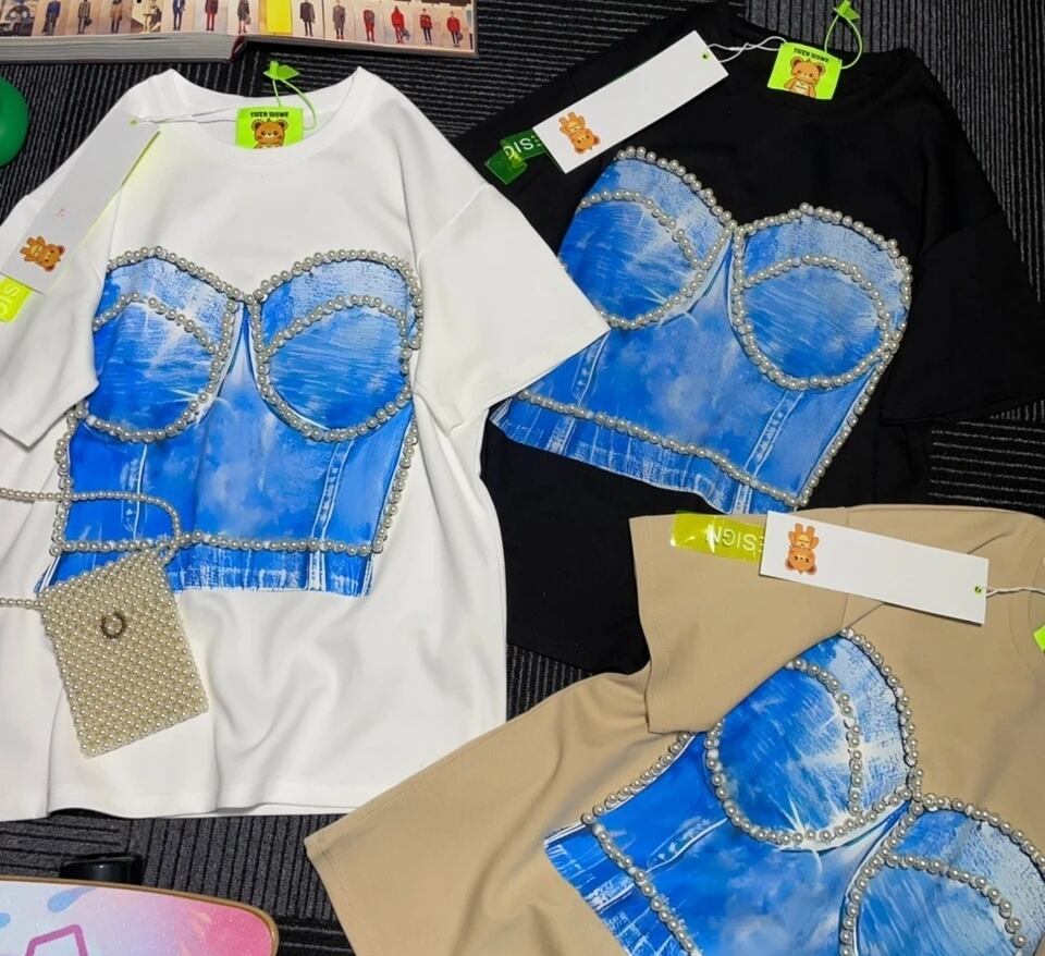 遊び心満載の個性的なプリントと、プリントの上に配置されたパール装飾が目を引きます。