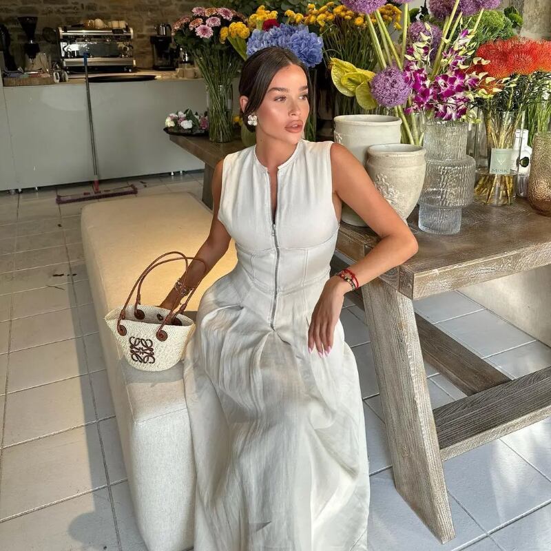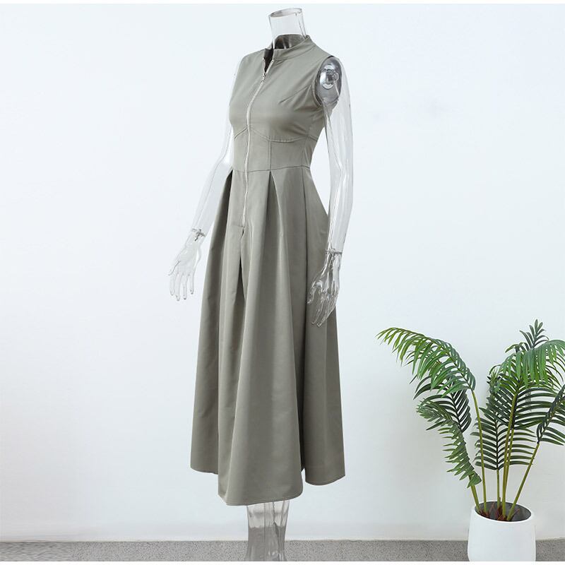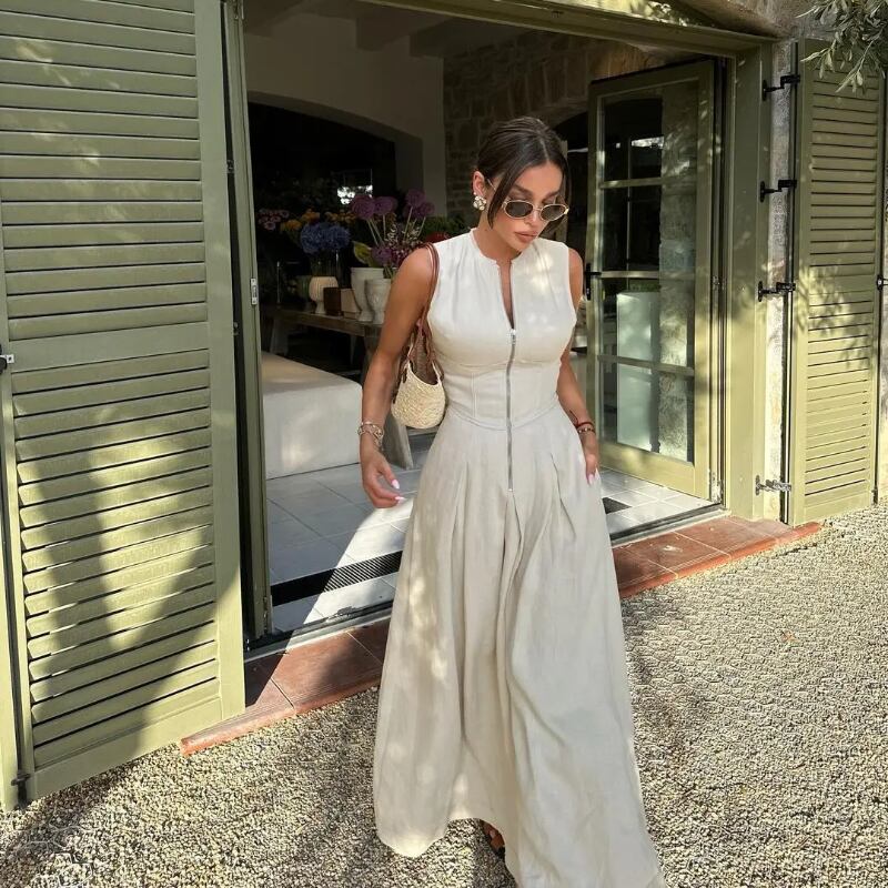マキシワンピースの優美さと胸元のジップデザインが特徴のサマードレス。2色展開でお届けするこのリュクスなドレスは、あなたの夏のワードローブに華やかさを添えます。