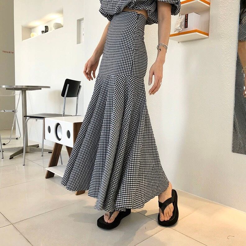 チェック柄セットアップは、ショート丈のトップスとハイウエストのスカートで構成されたおしゃれなセットアップです。